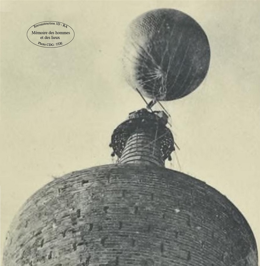 Septembre 1900 - Archives "livres" FDE/CDG - Ballon à filet du génie, gonflé à l'hydrogène, avec aérostier suspendu dans harnais en train d'amarrer le drapeau franç;ais Pékin, île de Jade - "Stupa" boudhique ou "Péta" surnommé Pippermint par le Corps Expéditionnaire International à cause de sa ressemblance avec une bouteille d'alcool de menthe connue "sur cinq continents" Voir livres LA CHINE A TERRE ET EN BALLON par des officiers du Génie du Corps expéditionnaires et Le Génie en Chine 1900-1901 par Cel Legrand (X 1876) édités par Berger-Levrault en 1902 et en 1903 Libellé extrait de la planche 13 / photo 4: "Le Cdt de la Sion d'aérostiers monté sur un ballon, attache le drapeau français au sommet du Péta" complété par le nom possible LINDECKER comme "Cdt de la Sion d'aérostiers". En Août 1914, d'après les sites web - "cerfvolant.militaire.free.fr", le CB Lindecker commande la place forte d'Epinal et le Cne Saconney y est affecté comme "Chef du dépôt de matériel du parc d'attache". - "irsem.fr/ballons", deux sections automobiles de ballons captifs et de cerfs-volants sont regroupées à Epinal sous les ordres du Cne Saconney. |