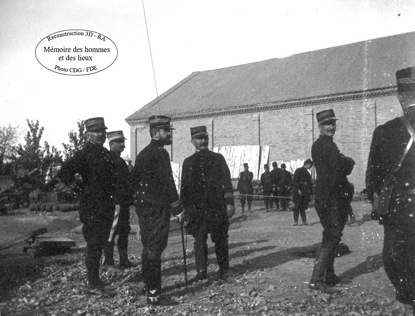 Octobre 1900 - Archives "Photos" FDE/CDG - Tampon "Section d'aérostiers du génie" - Quartier des aérostiers au Péta - Au sol de G à D, Lcl Legrand (Cdt Génie de la partie FR du CEI), Lcl FDE (major garnison secteur FR de Pékin), le Lcl Marchand (barbe reconnaissable) , cable retenant le ballon attaché au sol après démonstration d'ascension avec les 6 sapeurs l'ayant préparé puis gonflé à l'hydrogène, Cdt Germain, Cdt Chatelain |