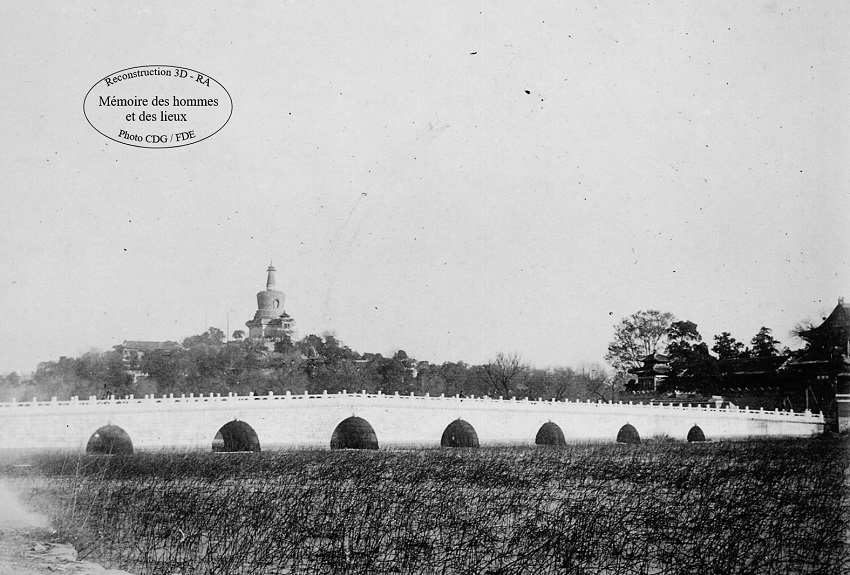 | Septembre 1900 - Archives "Photos" FDE/CDG - Tampon "Section d'aérostiers du génie" - Libellé au dos de la photo: "Le Péta, la Rotonde et le pont de marbre pris de la maison de Waldersee. Les herbes dans le lac sont des lotus en fleur en Septembre; coup d'oeil délicieux". |