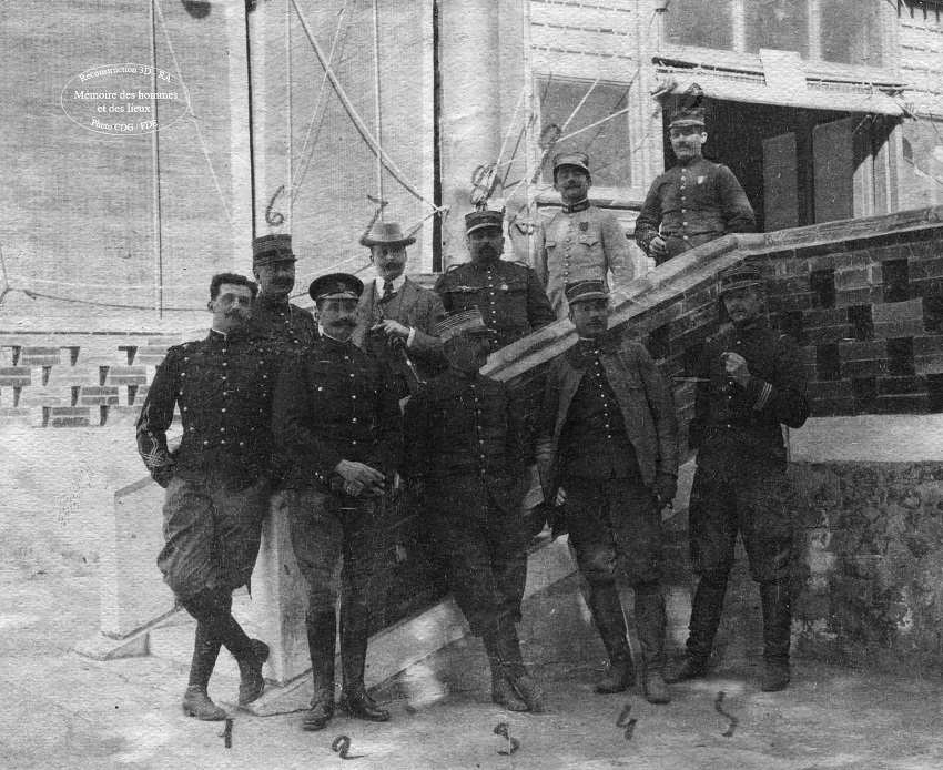 Mars 1901 - Archives "Photos" FDE/CDG - Libellé au dos de la photo: "Un déjeuner à la Rotonde en Mars 1901; cliché du Lt Still, officier d'ordonnace du Gal Gazelee; 1- Leclerc: adjudant de garnison; 2- Cne Diet: aide de camp du Gal Gazelee; 3- Moi; 4 Girardet: S/Lt du Train; 5- Cne Breuihl: renseignements; 6- Cne Thery: Prévôté; 7- Froment: meunier amateur; 8- Cne Bejol: Train; 9- Cdt Beyraguel: adjudant de garnison; 10- Lt Panet: infanterie de marine".