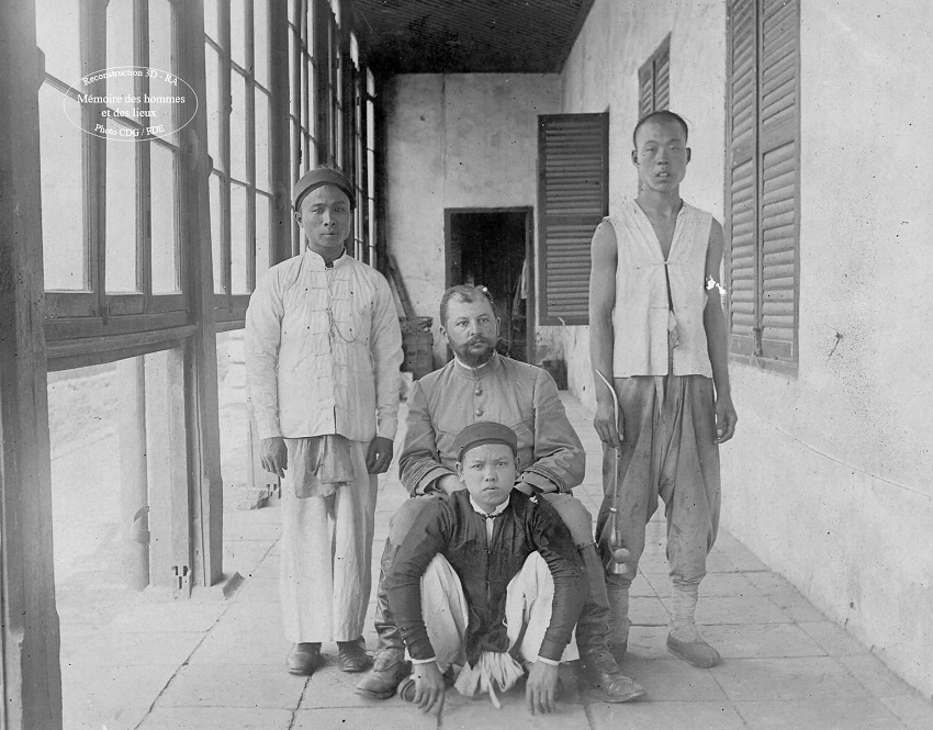Mars 1901 - Archives "Photos" FDE/CDG - Libellé au dos de la photo: "Cne Sauvage, chef de la popote; les Pères m'envoient un cuisinier qui recrute ses marmitons; bref, ma maison se monte et nous dînons le soir dans notre salle à manger toute en verre, vêtus de nos manteaux de fourrures."