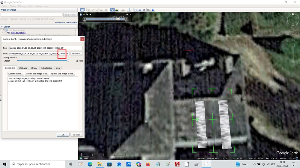 Date image satellite 5/2019 (meilleur cadrage en Y pour cuisine; sur 10 ans, manoir change de position de quelques m) / Cadrage XY GPS à déplacer d'environ 3.5m vers Nord