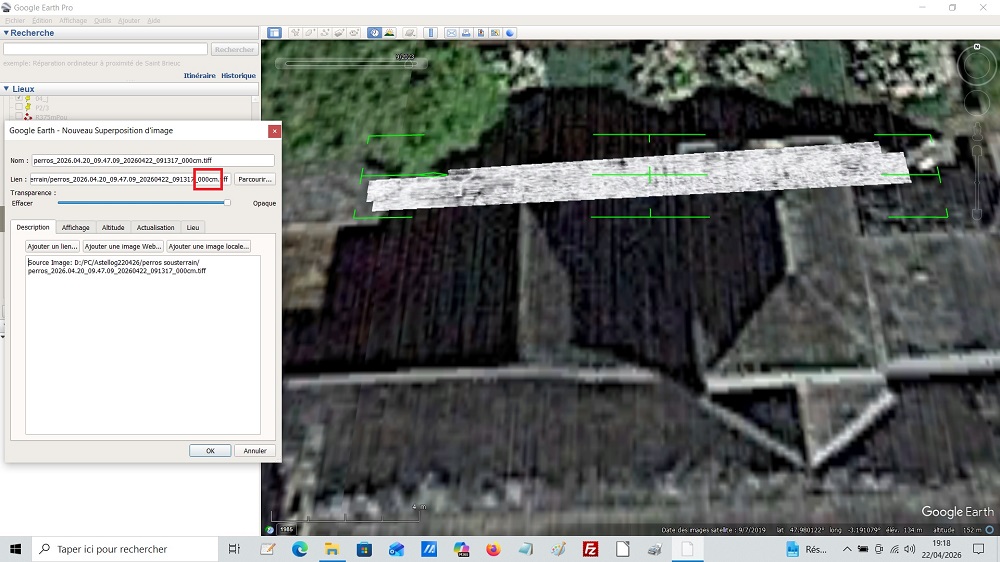 Date image satellite 9/2023 (en haut à gauche) / Cadrage XY GPS à déplacer d'environ 4m vers Est