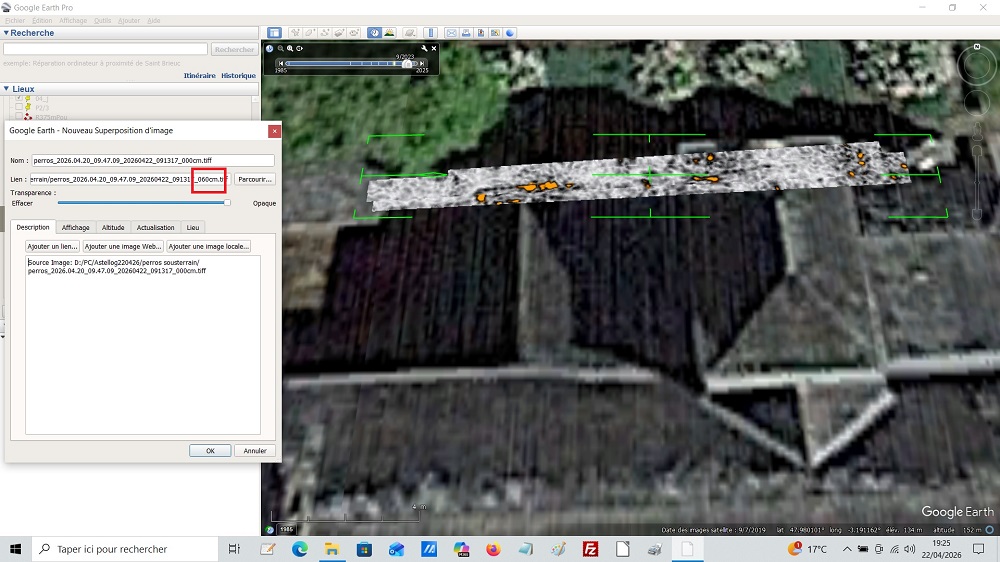 * Bordure Sud: coin bibliothèque bleue (gouttière Nord Sud visible en gris) sous passage Ouest-Est tuyau arrivée eau SAUR (zoom: barre noire de 1 "petit" doigt de large avec 2 points oranges)