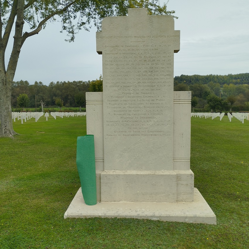 03/10/2025 - Photo PHENIX MEUSE de la partie arrière du monument avec une planche verte de 1m de haut (dimensions monument: Hauteur 2.75m, Largeur 2.0m); monument à faire par photogrammétrie (2 jours: J 01 aller Belleray/prise de vues/dépouillement, J 02 rattrapage/dépouillement/retour Paris) dans créneau 12h-14h - temps uniformément couvert, pas de pluie, vent moyen inférieur à 10km/h (drone) - à trouver avec METEOCIEL; - soit au SOL avec mât télescopique et SONY ou NIKON; - soit par AIR avec drone de moins de 250g DJI Mini 3 Pro; - soit au SOL et par AIR pour choisir le meilleur résultat. |