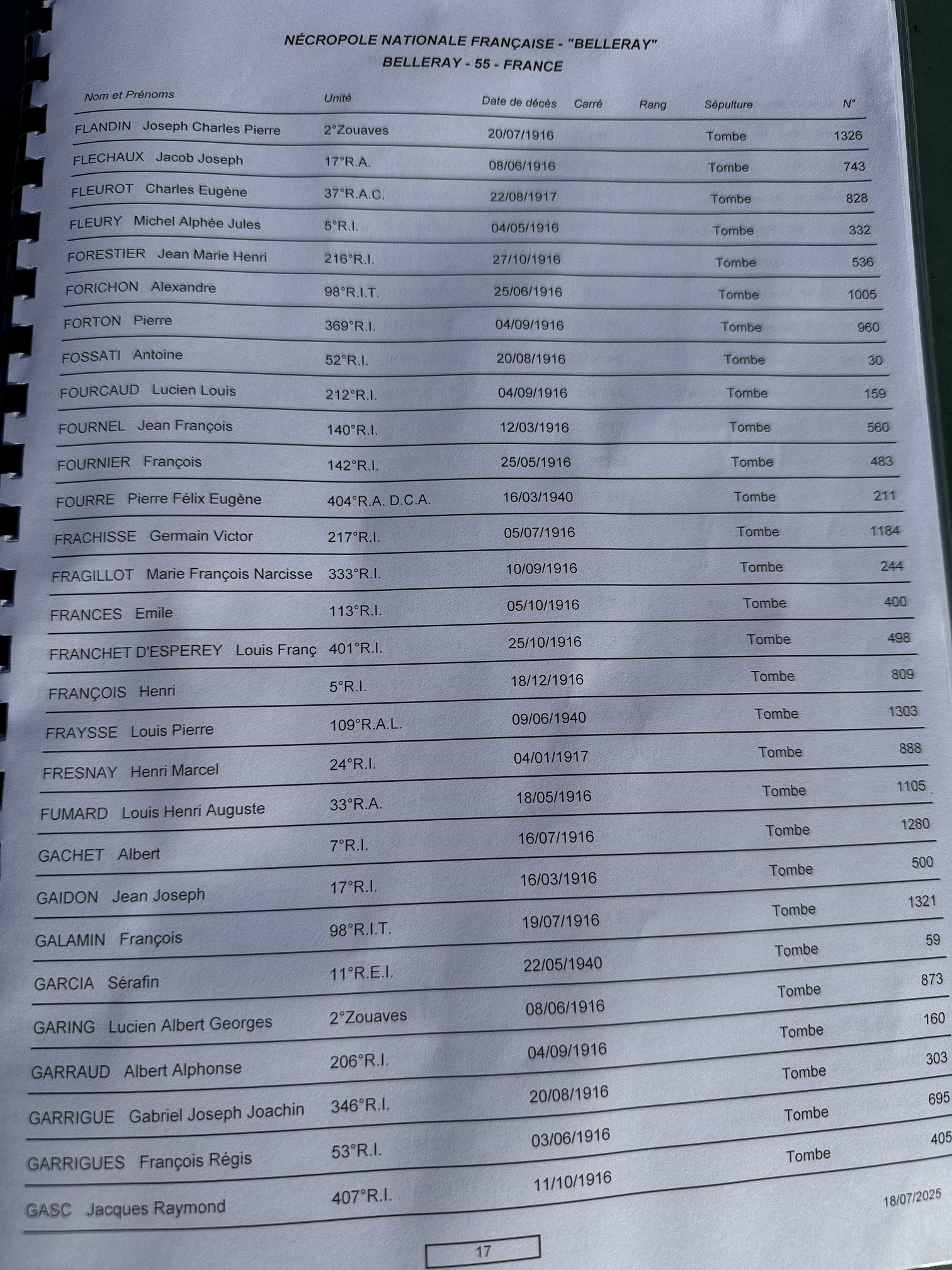 En consultant le registre ALPHABETIQUE de la nécropole / page 17, la localisation de la tombe (carré, rang) n'est pas renseignée à la date du 18/07/2025 (date en bas et à droite de la feuille).