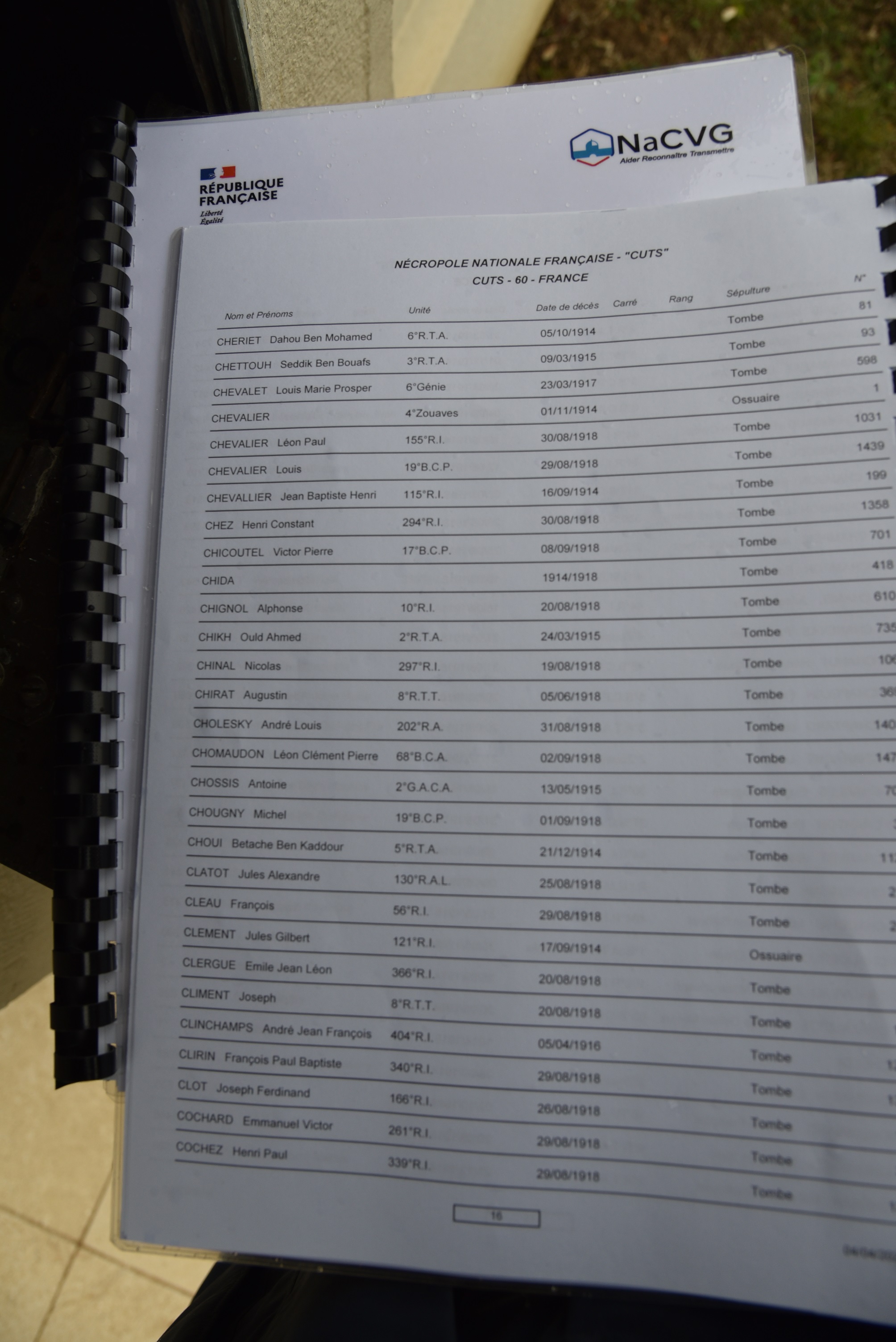 NB: A la nécropole de Cuts, visitée le 14/11 (tombe Cholesky X 1895), à partir du n° de la tombe trouvée dans le registre ALPHABETIQUE, le registre LOCALISATION permet de se diriger vers elle: Section, Rang, Place.