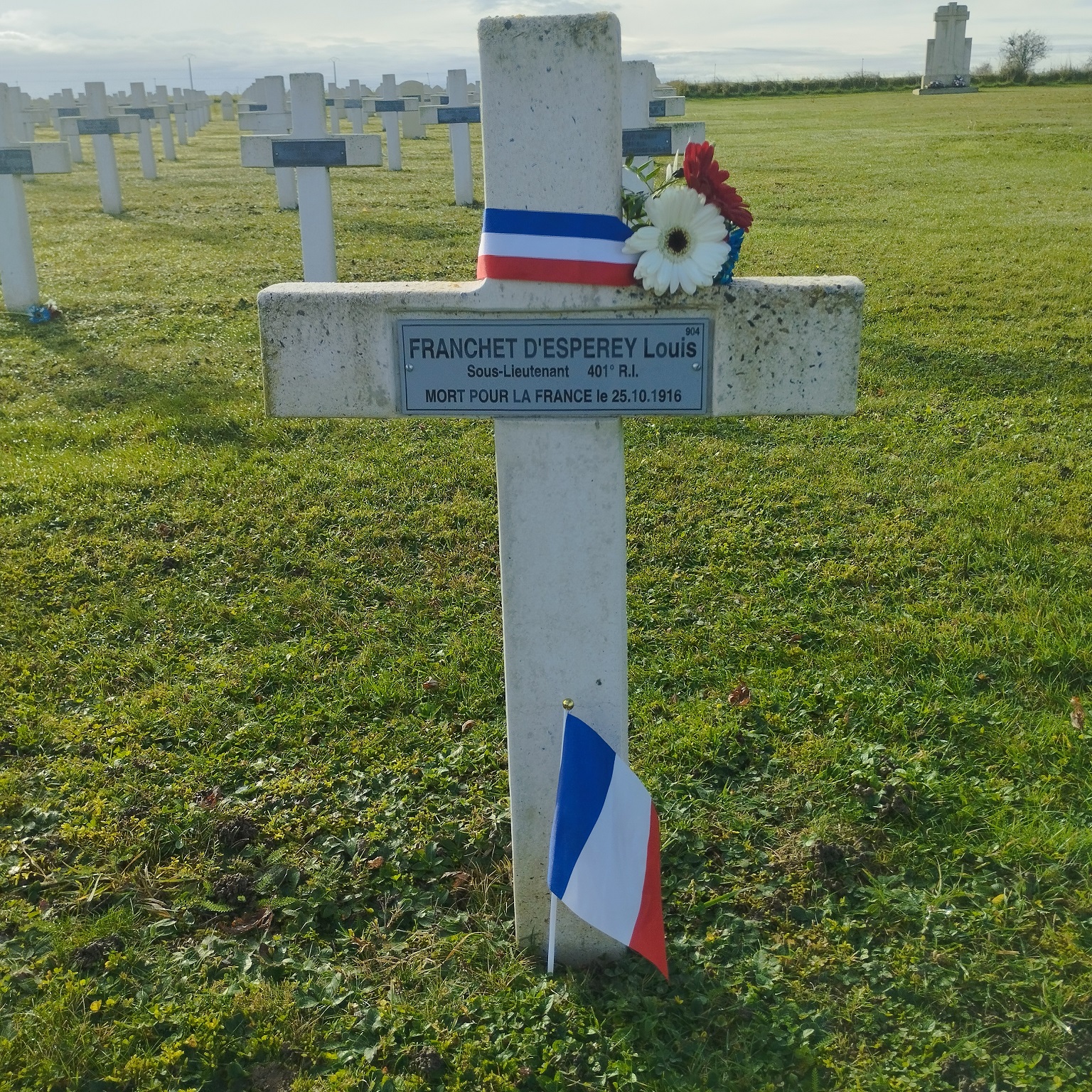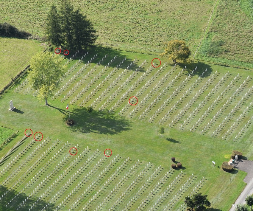 NB: Le 11/11/2025, PHENIX MEUSE a honoré plusieurs tombes (petit drapeau au pied, ruban tenant bouquet tricolore sur branche verticale haute) dont celle du S/LT Louis FDE. La stèle du S/Lt Levy (Côté EST, Rang 13, Place 4) est visible sur la photo en lien et sur la photo oblique ci-dessus entourée d'un petit rond rouge comme celle du S/Lt FDE.