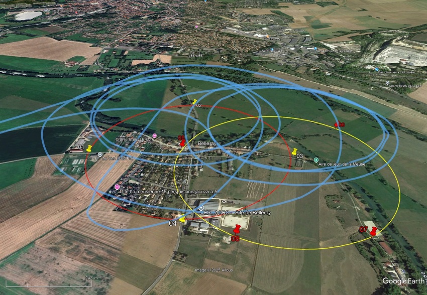Trajectoire arrivée Belleray, 3 tours sur clocher (doigt malencontreux a fait varier focale donc 1 tour de plus), 2 tours sur nécropole et retour - Retour plus rapide qu'à aller (composante vent Est nous pousse)