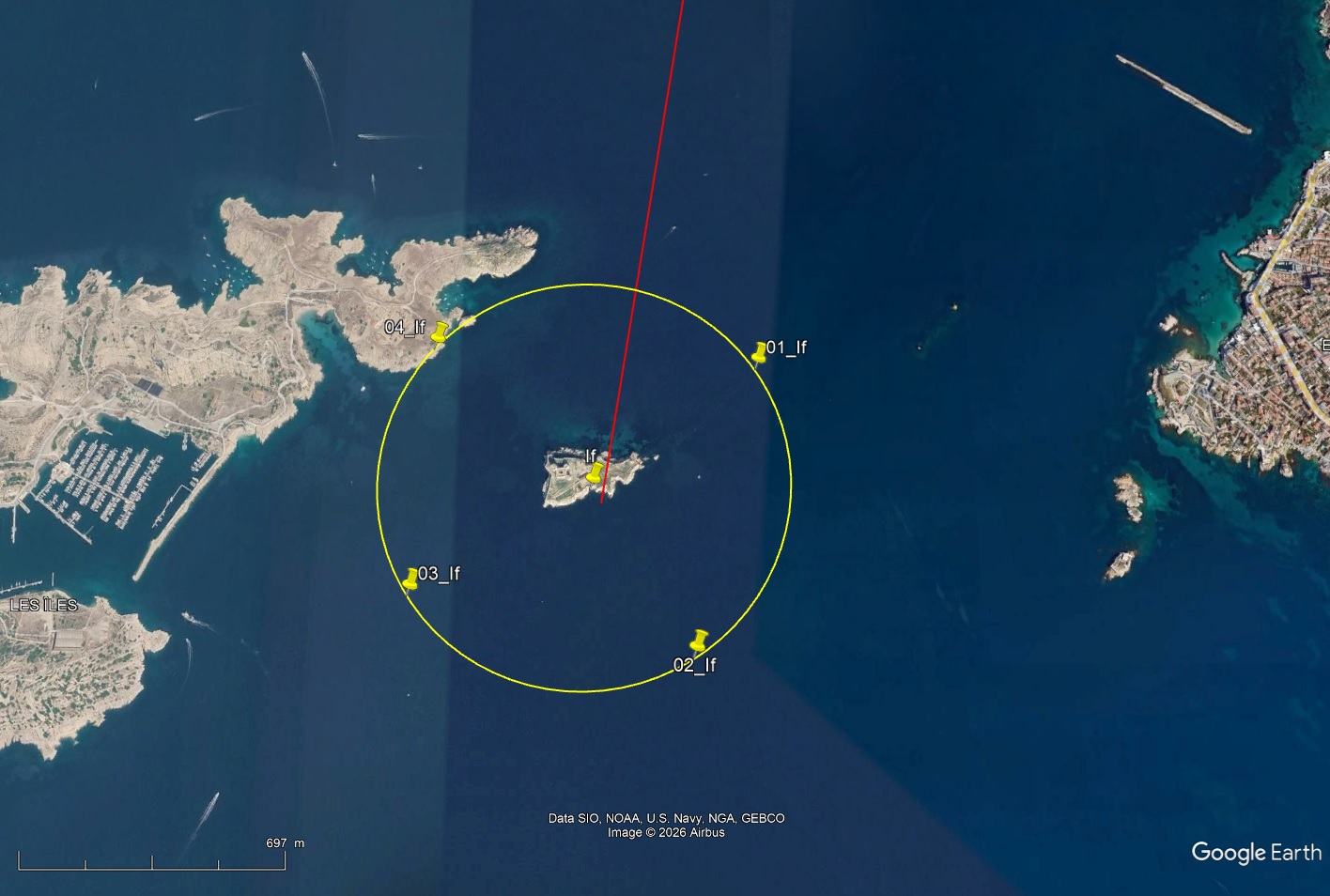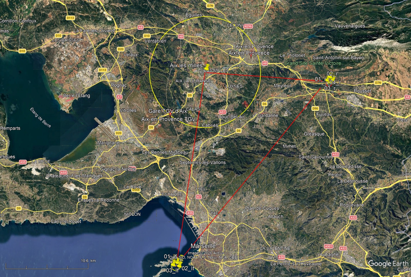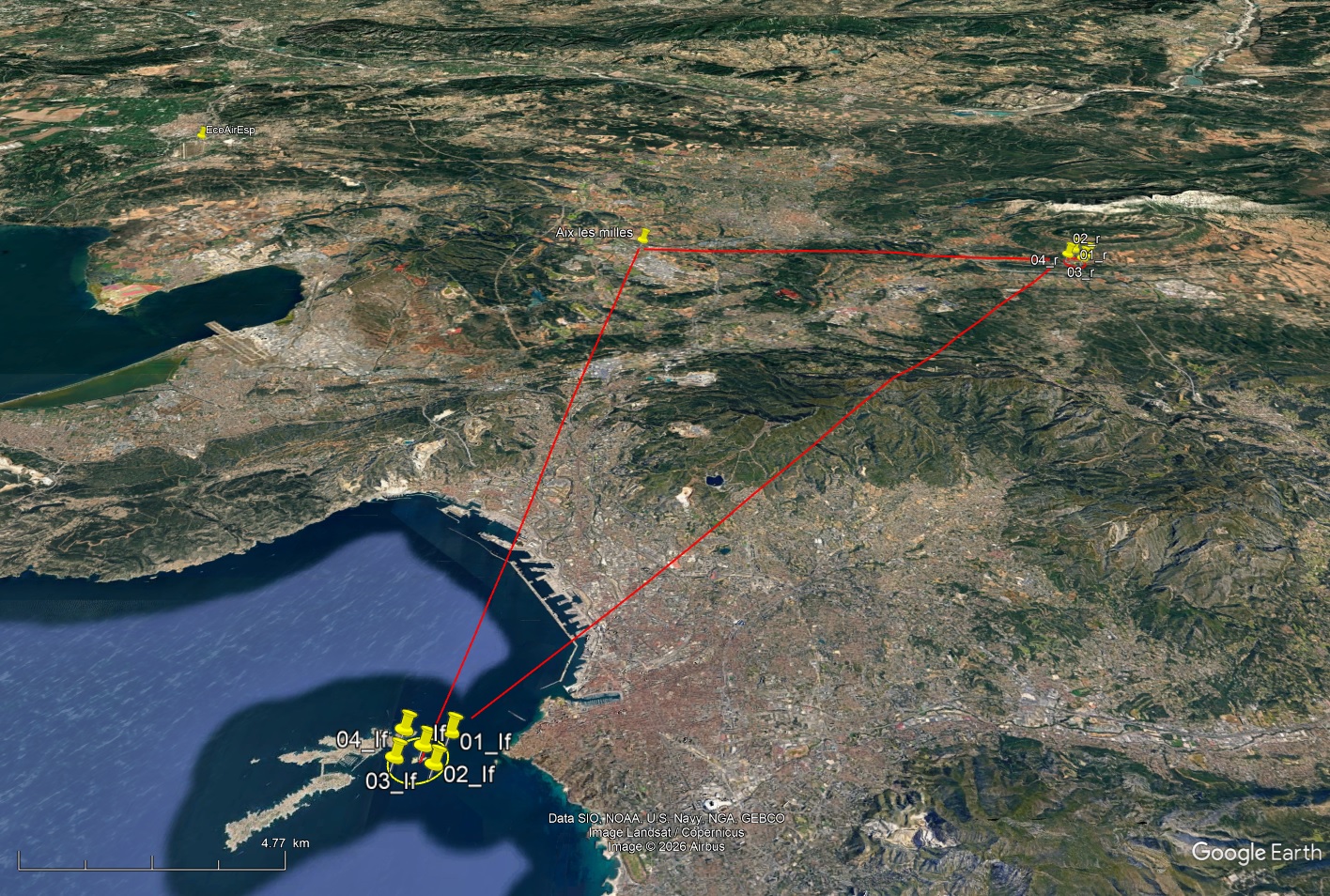 Fig 1 - Perspective Google Earth - Itiméraire aérodrome d'Aix-les-milles, Châteauneuf-le-rouge, Châteaud'If et retour (Ecole de l'Air et de l'Espace en haut à G)
