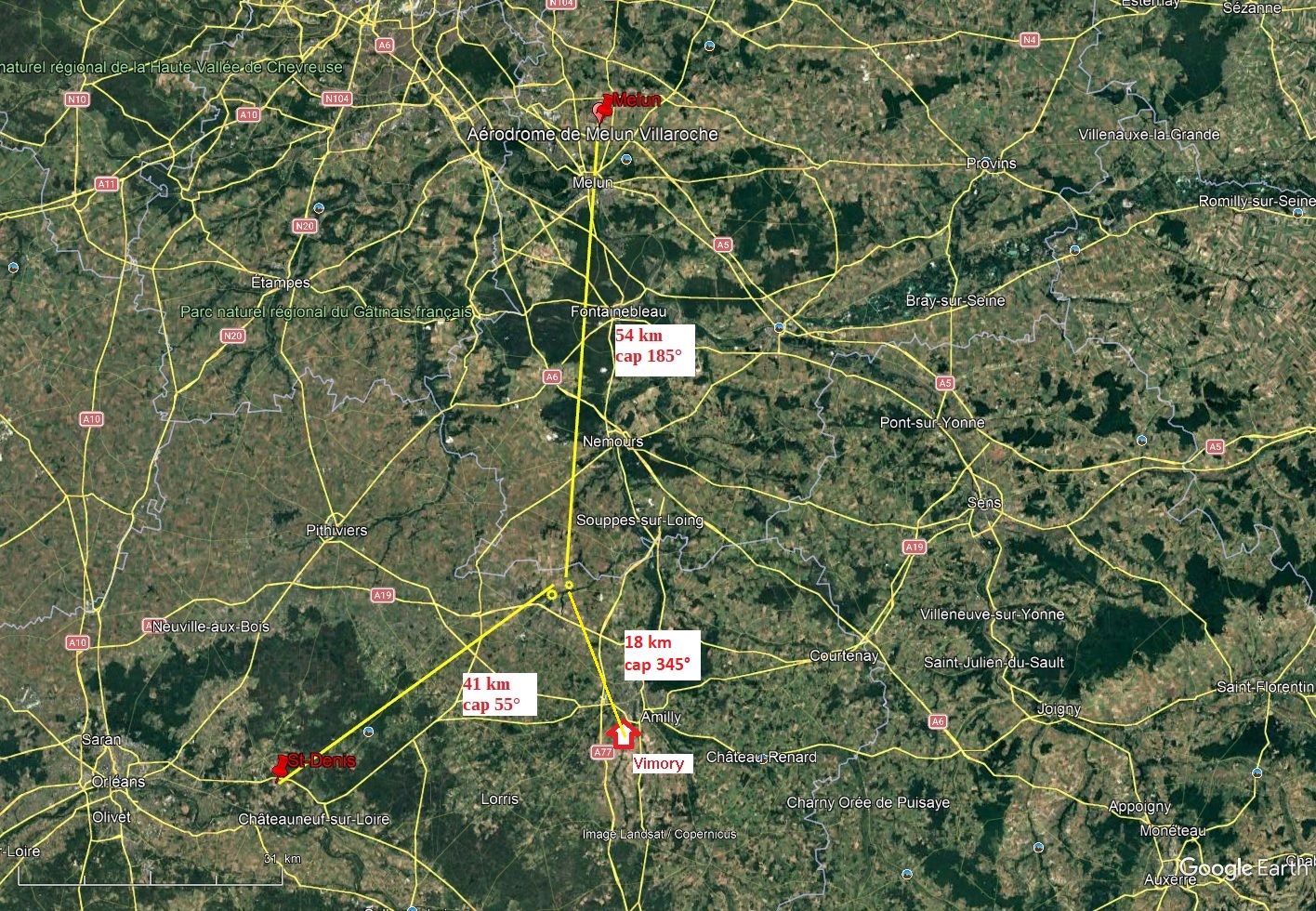 Fig 1 - Itinéraires possibles aller-retour ULM - Aérodromes de Melun, Saint-Denis de l'hôtel, Montargis-Vimory