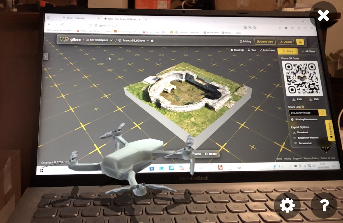 12/03/2026 - Réalité (fontaine sur écran PC) Augmentée (jumeau DJI Mini 3 Pro de Sketchfab positionné sur clavier) avec iPhone 8