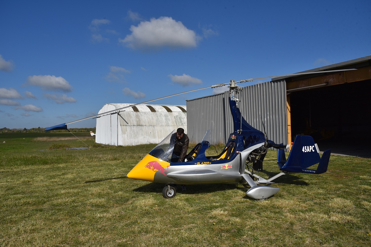 Fig 13 - Autogire BRAKO et son pilote - Biplace en tandem à l'air libre sans cockpit