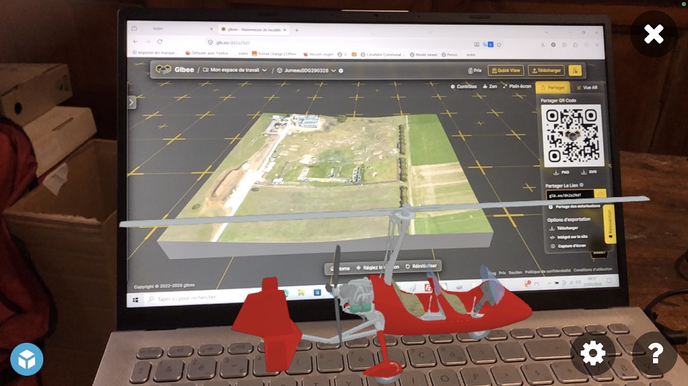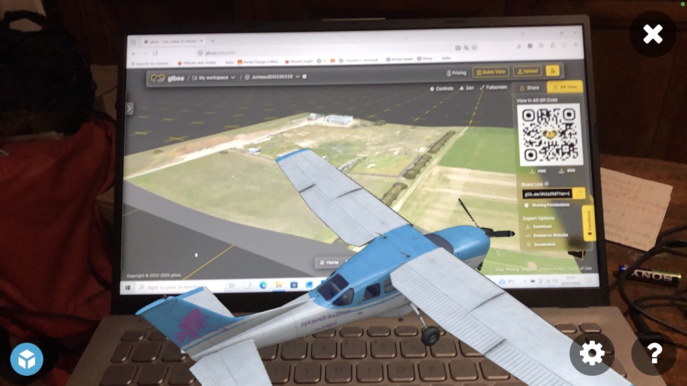 Vue en Réalité (jumeau site AQUAE SEGETAE de GLB.ee) Augmentée (Cessna 206 de Sketchfab) du PC de traitement photographié avec un iPhone 8