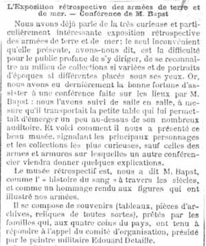 Nous avons déjà parlé de la très curieuse et particulièrement intéressante exposition rétrospective des armées de terre et de mer; le seul inconvénient quelle présente, avons-nous dit, est la difficulté pour le public profane de sy diriger, de se reconnaître au milieu de collections si variées et de portraits dépoqus si différentes placés sous ses yeux....