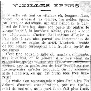 C'est une nouvelle salle du musée de l'Armée, aux Invalides, où le général directeur vient de rassembler quelques unes des armes les plus précieuses, par la perfection de leur travail ou par les souvenirs qu'elles évoquent. On l'a nommée salle Richelieu, ce qui est d'une idée tr&eagrave;s heureuse...