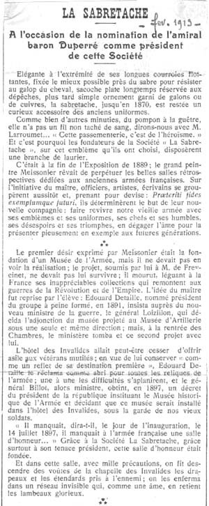 Il manquait, dira-t-il, le jour de linauguration, le 14 Juillet 1897, il manquait à larmée française une salle dhonneur .... Grâce à la Société La Sabretache, grâce surtout à son tenace président, cette dalle dhonneur était fondée...