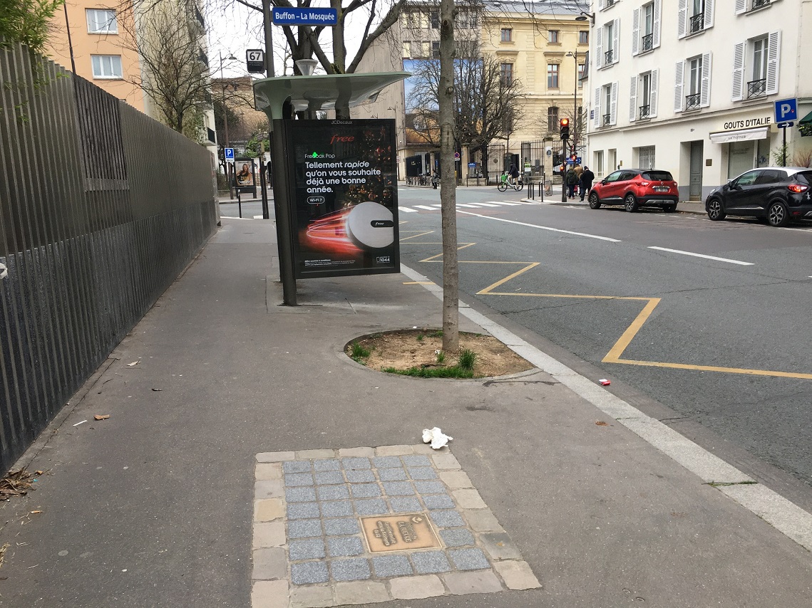 Plaque en bronze "ancien lit de / LA BIEVRE / La rivière coulait / entre les bâtiments du 32" sur trottoir