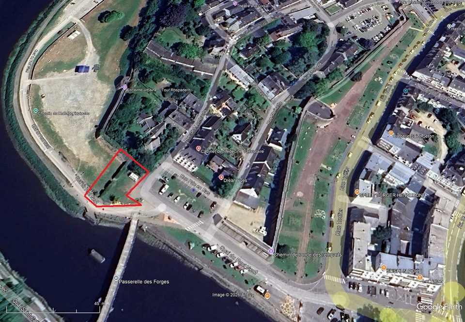 09/02/2026 - GOOGLE EARTH - Hennebont AU DESSOUS DU SOL Fouilles archéologiques "Porte d'EMBAS", "Hôtel MAUDUIT" (disparus), square MAUDUIT au bout de l'actuelle rue des Lombards Voir page 58 §3.7 Conclusion et page 59 Croquis INRAP - Avril 2020/Square Mauduit/L. Beuchet Mot Barbacane utilisé dans la conclusion |