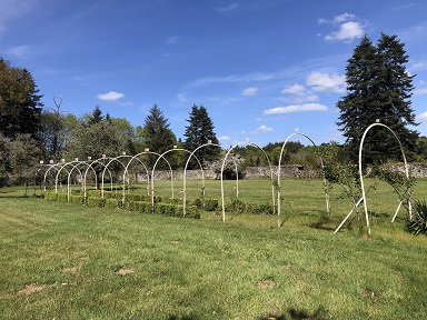 18/04/26 - Pose 10 boucles en rubalise rouge-blanc sur arceaux avec rosiers plantés en Février