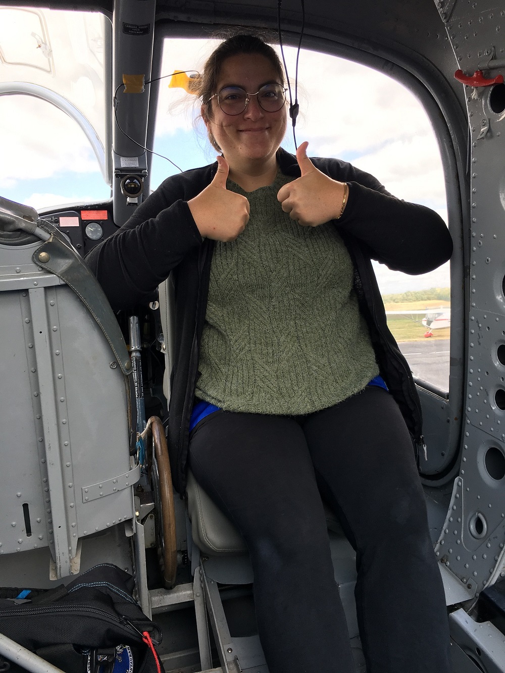 ---22/08/2025 - iPhone 8 Grand-père - Après avoir scotché l'antenne GPS (Garmin GPSmap96c) sur le pare-brise derrière elle, pouces en l'air de la navigatrice Béatrice prête au décollage