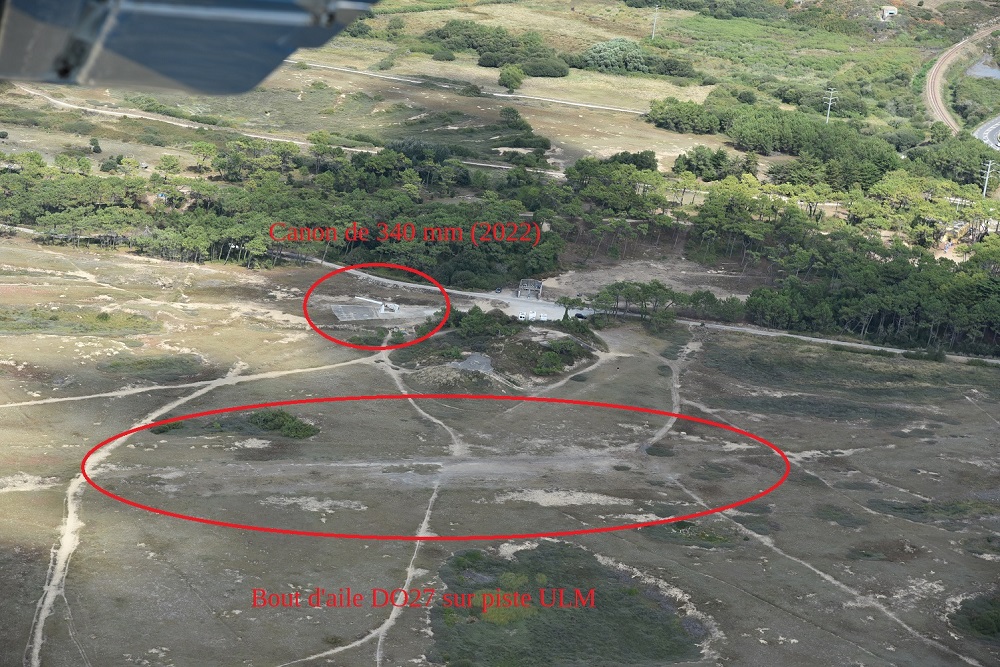 ---22/08/2025 - Virage 90° à droite pour se mettre en // piste et voir canon de 340mm récupéré au Centre d'Essais de Lancement de Missiles de Gâvre et installé en 2022 à entrée de la batterie au "garage" sur le chemin du Bégo et de l'accès aux plages (La Guérite, Ty Hoche) |