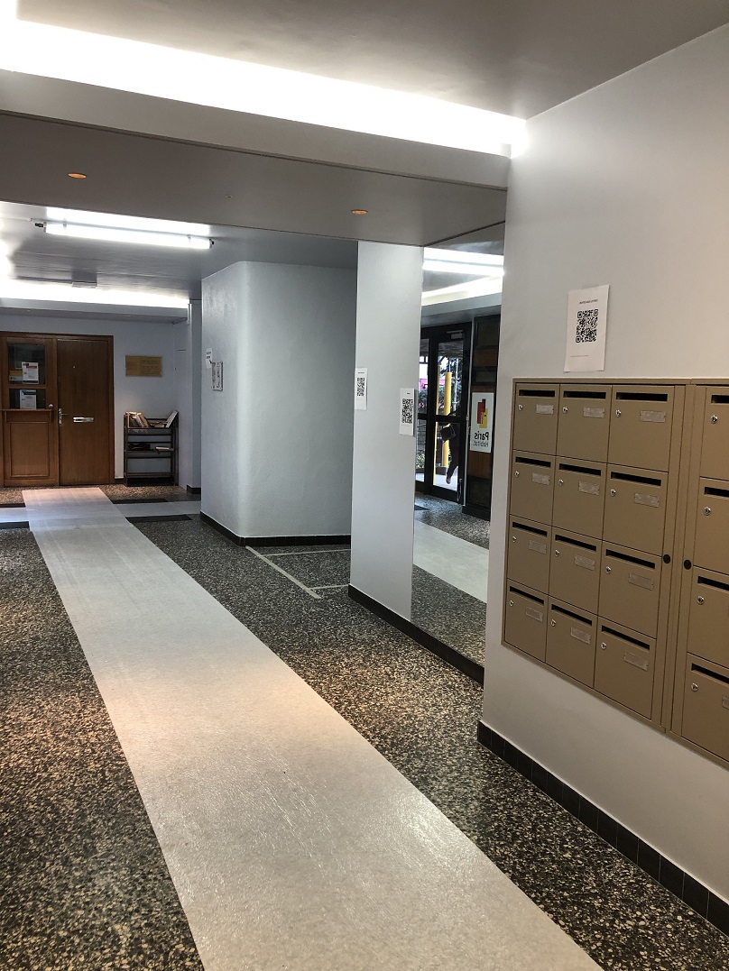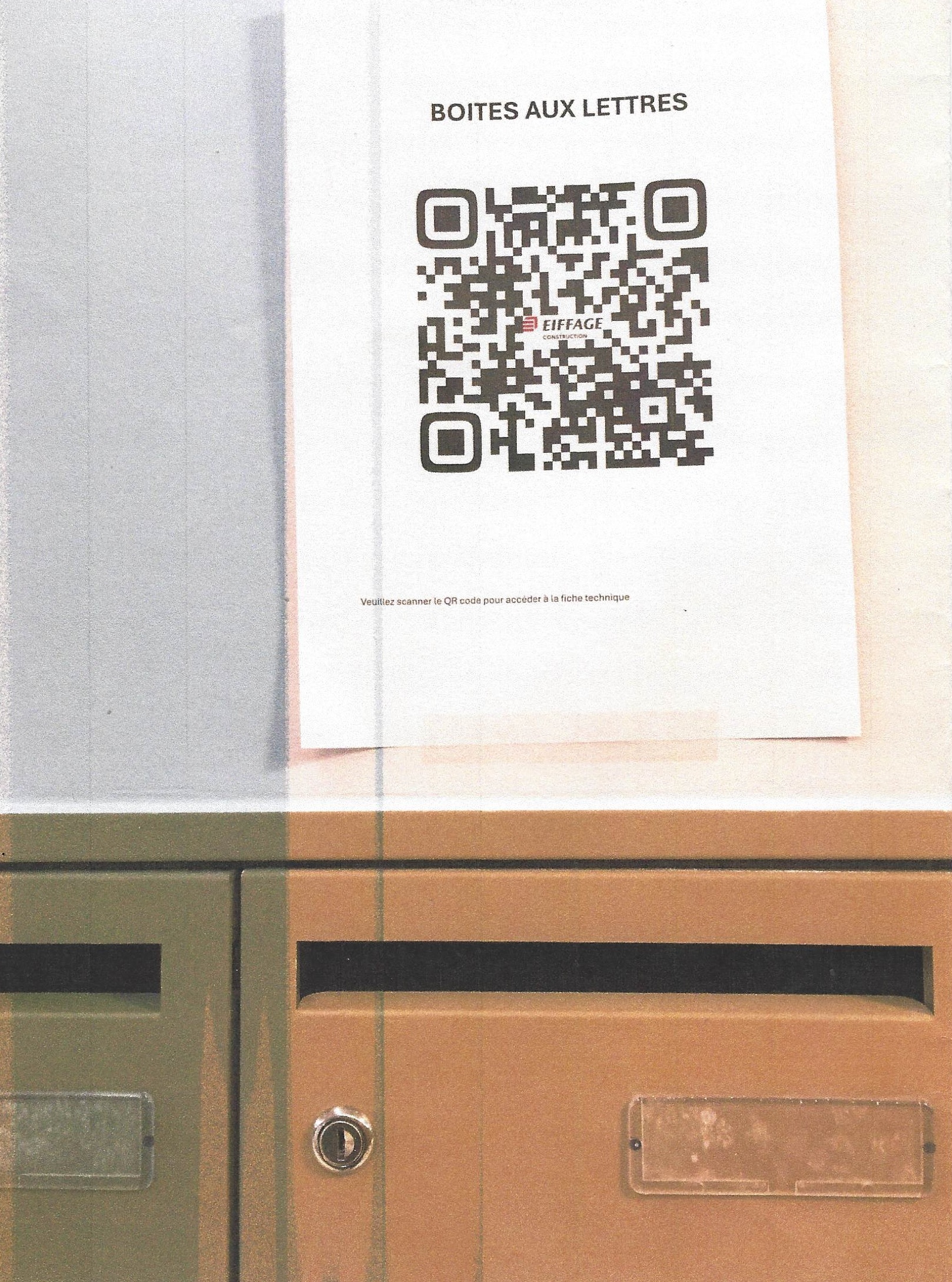 10/12/2025 - EIFFAGE, Référente locataire et coordinatrice travaux: Installation - panneaux sécurité incendie (ancien plan avant rénovation, modèle nouveau plan après); - affiches format A4 "QR code avec logo central (EIFFAGE)" vers "produits" (boîte aux lettres, glace, spot encastré, luminaire tube , luminaire carré, porte du hall".