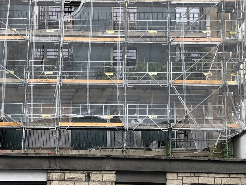 26/09/2025 - Photo prise de la rue de Santeuil - 1er étage, 2 ouvriers AMIANTECH (en charge pose cadres fenêtre) en combinaison de protection blanche avec masque, devant "Chambre" (à D) et "Petit salon" (à G)