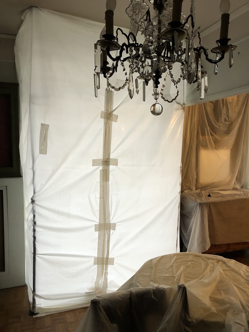 26/09/2025 - Photo prise dans "petit salon" montrant sas protection fenêtre et bâche protection mobilier posée par locataire (toutes les pièces sauf cuisine et salle de bain)