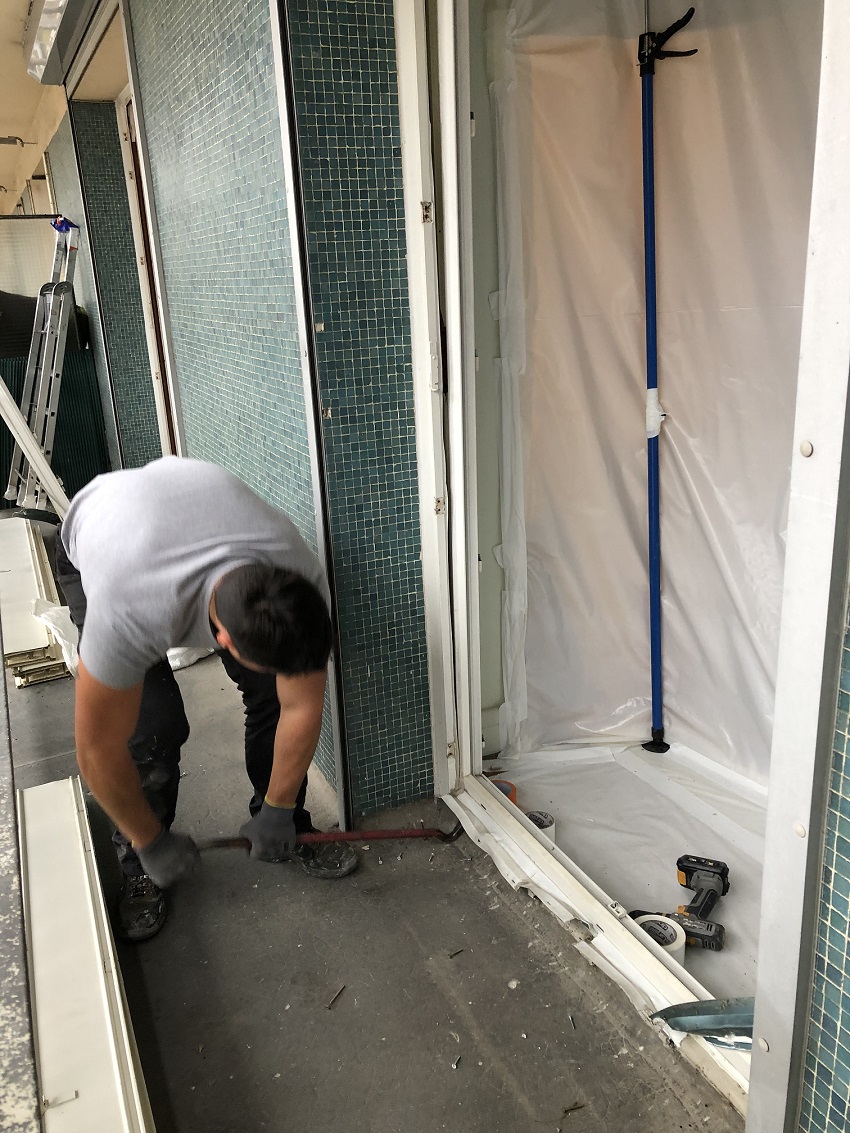 - Photo prise du balcon montrant démontage extérieur cadre fenêtre "salon" par AMIANTECH