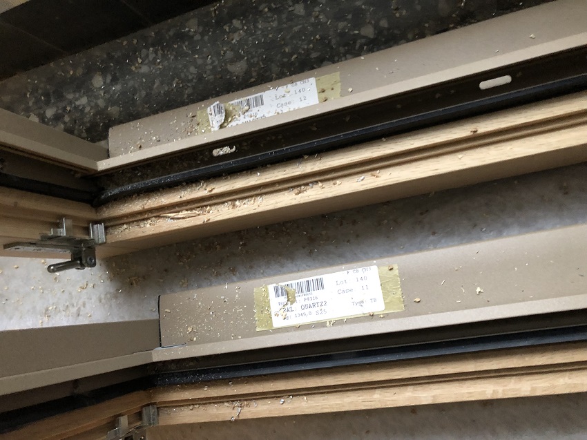 26/09/2025 - Photo prise sur palier - Cadre bois-alu en attente - Fiche produit (cadre + fenètre + volets) demandée le 25/09 à Mme Zou (référente EIFFAGE "locataires") par courriel et oralement à Mr Meaux (référent EIFFAGE "fenètres")