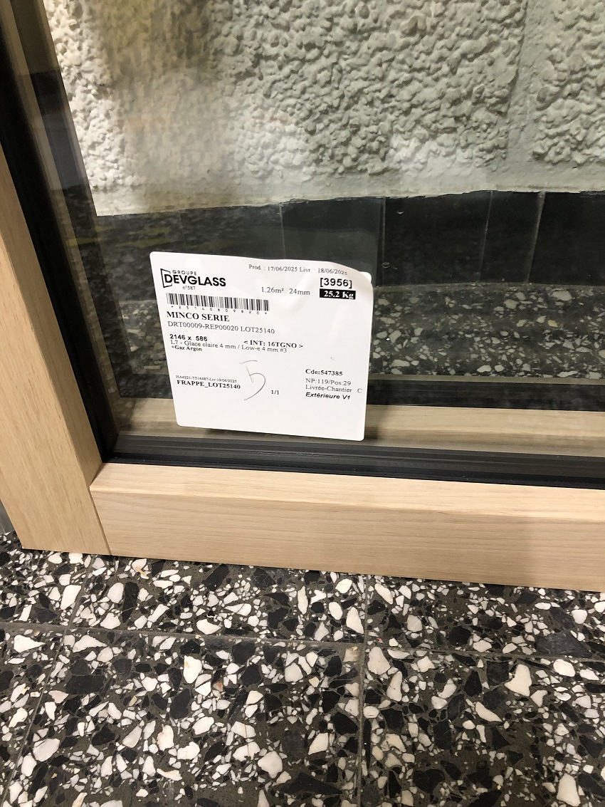 26/09/2025 - Photo prise devant mur corridor face entrée escalier D - Etiquette fabricant vitrage mais pas fenêtre+vitrage - PHENIX FENETRE FRANCE sur registre des entreprises (02/01/2019, Mme Mitovska Bilyana); pas de site web, pas de réponse à message laissé sur répondeur 25/09/25) - Fiche produit (cadre + fenètres + volets) demandée le 25/09 à Mme Zou et Mr Meaux