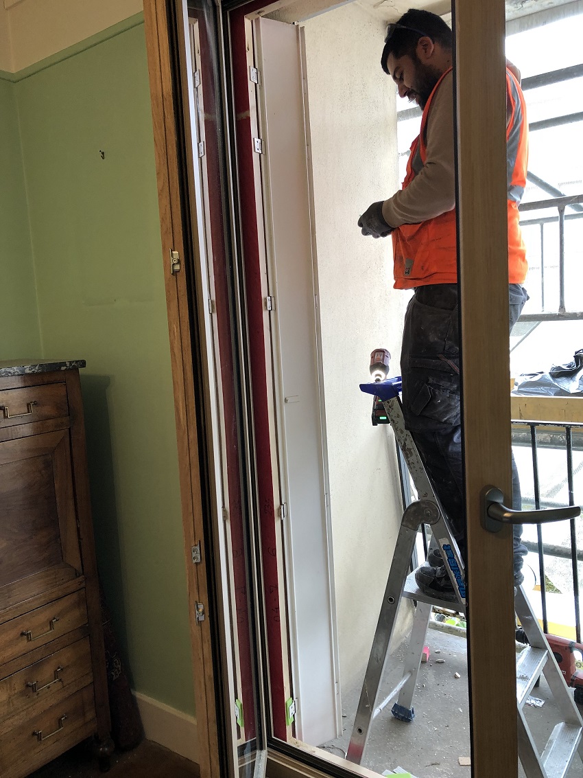 26/09/2025 - Remontage des "vieux" volets sur des cales vertes sur le cadre bois provisoire - Volets "neufs" à poser directement sur murs (?) - Fiche produit "Volets" à envoyer au locataire