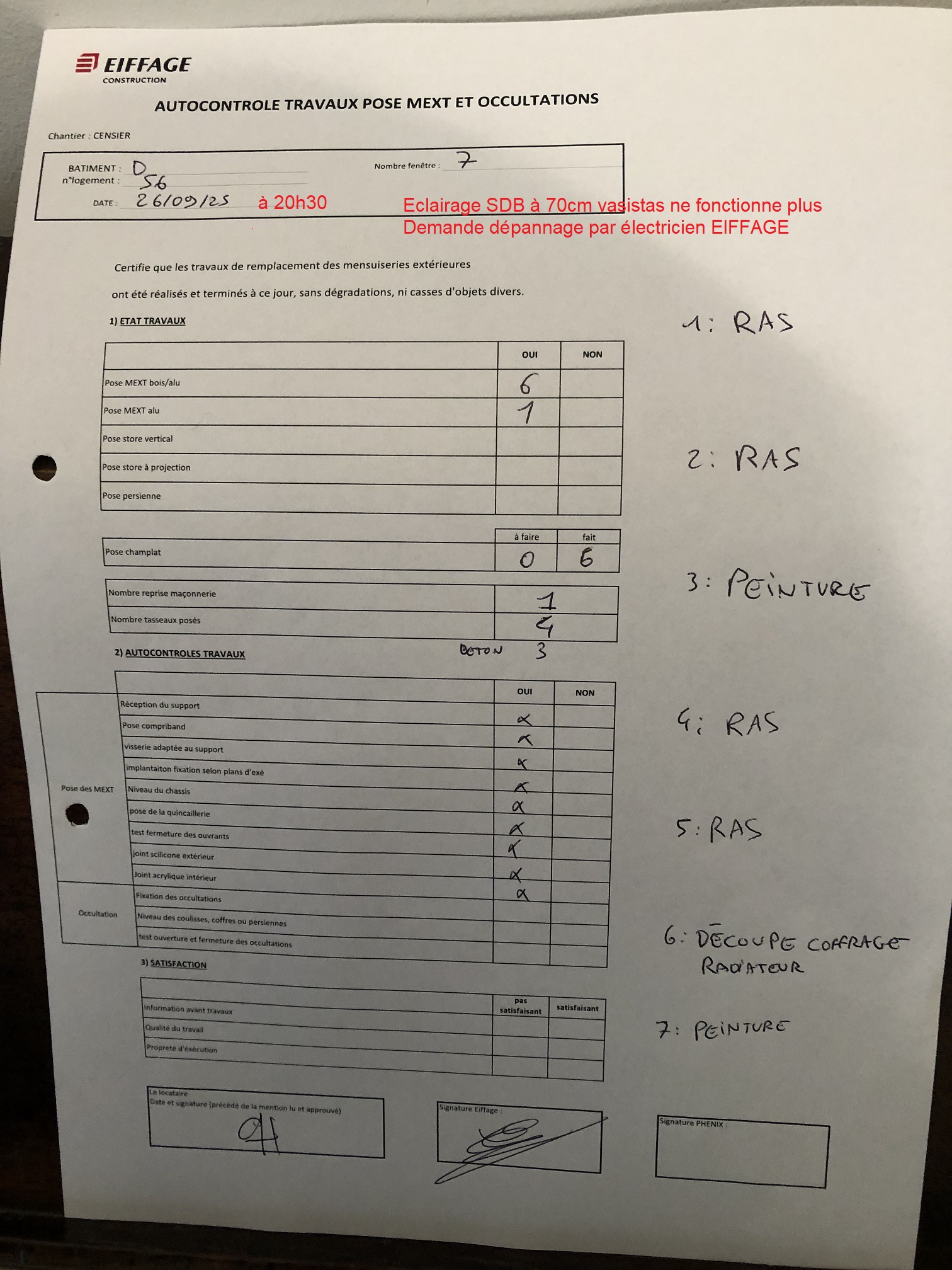 26/09/2025 20h30 - Constat éclairage salle de bain HS - Ampoule à vis est bonne; douille enlevée puis remise sur support et toujours pas de lumière; rien de disjoncté sur nouveau tableau électrique installé par EIFFAGE dans armoire de l'entrée; Demande dépannage EIFFAGE ajoutée à 20h30 sur Fiche AUTOCONTROLE du 26/09/2025 17h30 (vérification des 3 commandes électriques volets roulants métalliques mais pas de l'éclairage SDB à 70cm de l'emplacement du vasistas changé) |