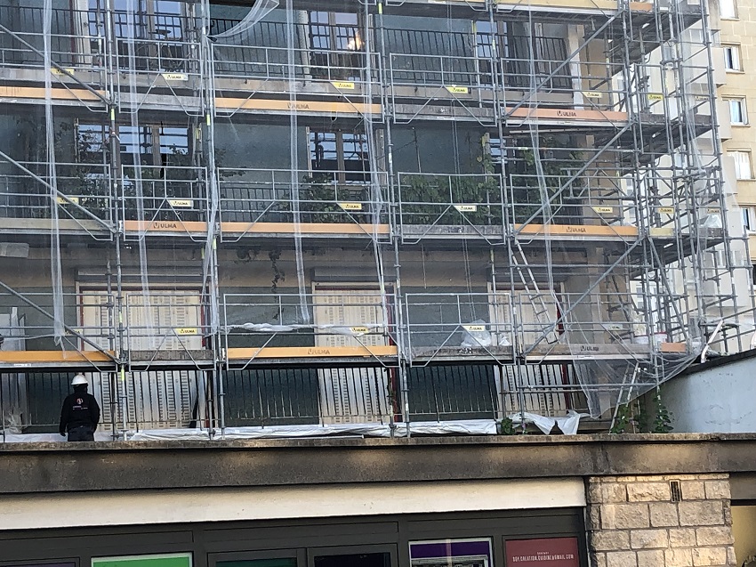- Ouvrier met protection sous garde-fou balcon rue de Santeuil - Photo prise de la rue de Santeuil