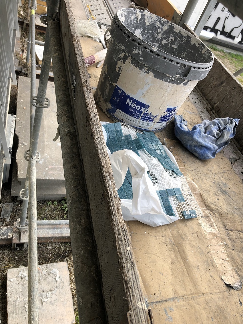17/12/2025 14h00 - Ouvrier remplace les parties de mosaïque manquantes à partir de grandes plaques contenant les petits carreaux de 2cm de côté. L'échaffaudage en place lui permet d'accéder à tous les étages de la façade Ouest. |