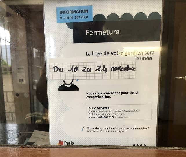 16/11/2025 - Demande 01 (voir courriel)- Ligne téléphone fixe 01 43 31 99 92 coupée (pas de tonalité, travaux EIFFAGE ?) depuis le 14/11; gardienne en vacances du 10 au 24/11 - Demande envoi technicien et remplacement n° fixe par n° portable pour les 2 digicodes (celui en panne de la porte d'entrée immeuble, celui de la porte escalier D). 17/11/2025 17h10 - Sans réponse courriel de PARIS-HABITAT, locataire (logement 56 / 1er étage G / escalier D, Bâtiment D, 19 rue Censier) téléphone au 0 800 00 20 22 (URGENCE en dehors horaires ouverture), conseiller n'a pas connaissance du dossier; il intervient pour INCENDIE, GAZ, EAU, INTRUSION; enregistre Pb de ligne PTT coupée logement 56 pour le transmettre à son collègue à appeler dans les horaires d'ouverture de l'agence du lundi au vendredi 8:30 à 12:00 et 14:00 à 17h:00. 18/11/2025 - Suite demande 01 restée sans accusé de réception - 9h30 Contact téléphonique 01 85 34 15 00 avec agence 20-22 rue Geoffroy St-Hilaire; référence locataire 052843/75; enregistrement courriel du 16/11 fait le 17/11, délais de réponse 15 jours; conseil: servez vous de votre portable si votre ligne fixe est coupée. |