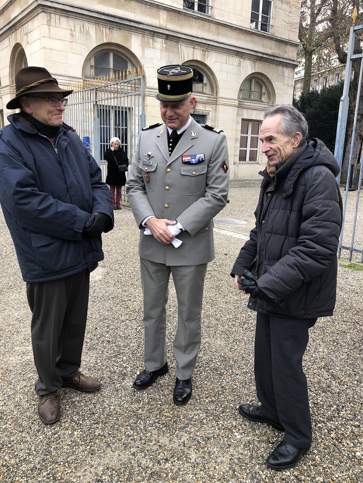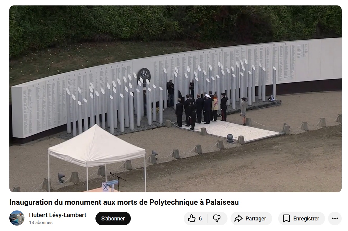 22/11/2025 - Paris 21 rue Descartes - Ministère ESRI - L'ancien monument aux morts des X est situé dans le jardin de l'ancien collège de Boncourt (voir pastille 2 sur 3D Sketchfab) Le nouveau monument inauguré le 8 Octobre 2014 à Palaiseau (voir jumeau numérique, photo, inauguration) est encore plus imposant. Il a été conçu par Hubert Lévy-Lambert (X 53). Grâce aux noms gravés sur 14 plaques de béton blanc poli (société GA, Samir Rizk(X 70)) posées sur l'ancien mur de brique, il permet de se souvenir de tous les X (2000 en un siècle et demi) ayant participé aux différentes campagnes depuis l'Égypte (AF Boye X 1794, "mort pour la Patrie" en 1799) jusqu'à l'Algérie (JA Guinard (X 1932, "mort pour la Patrie" en 1961). G. vers D. sur photo: Pdt X-Mémorial Louis-Alain Roche (X 69), Cel Cyrille Caron (Cyr 94) Chef de corps et Directeur de la formation humaine et militaire de l'École polytechnique, Pdt d'honneur de l'AX Laurent Billès-Garabédian (X 83) 26/11/2025 - Binets Photo et Mili - Il faut rappeler que la statue en bronze Le Conscrit de 1814 du sculpteur Corneille Theunissen, inaugurée le 8 Juillet 1914 dans cette même cour d'entrée, est actuellement sur le "platal" entre l'étang et le carré central d'accueil. |