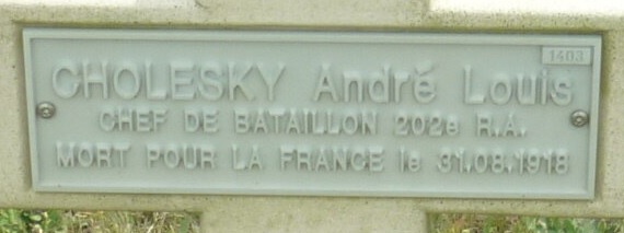 Voir photo et fiche de CHOLESKY André X 1895 artilleur et topographe, mort le 31 Août 1918 des suites de ses blessures au 202e RA; son nom est inscrit sur le mur dans la 6e colonne / année 1895 / 3e place (au bout des feuilles, sous le bout d'aile); il est enterré à la nécropole de Cuts dans l'Oise