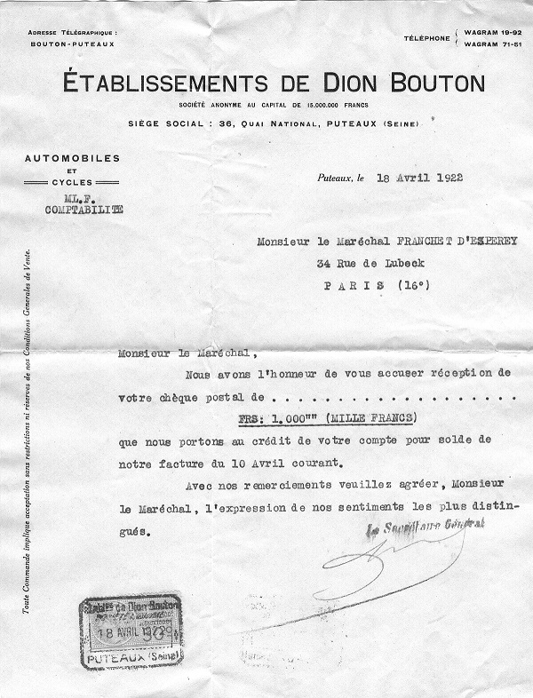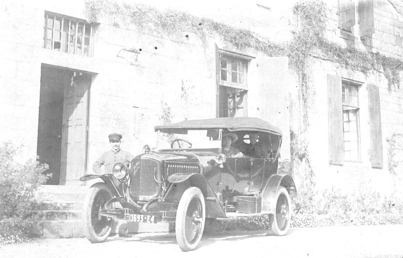 Juillet 1922 - Torpédo DE DION BOUTON 22HP (voir Solde facture DE DION BOUTON soit 1220) avec le chauffeur, Jacqueline d'Espèrey en place avant gauche et sa mère Alice à l'arrière - Voir ZOOM